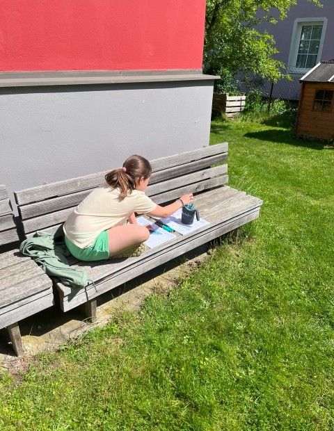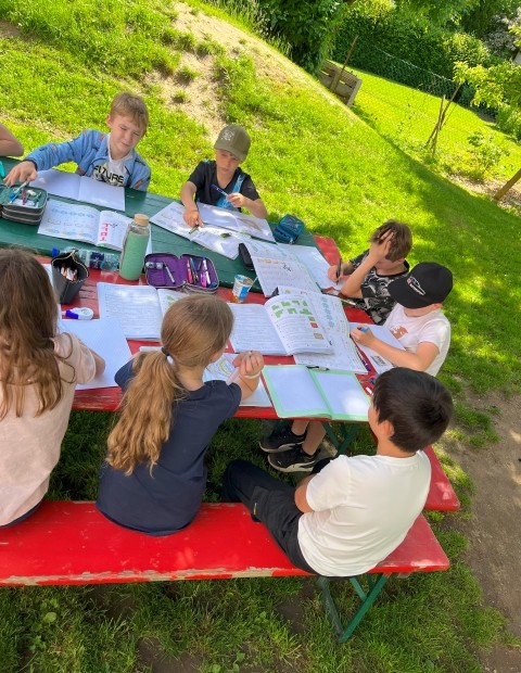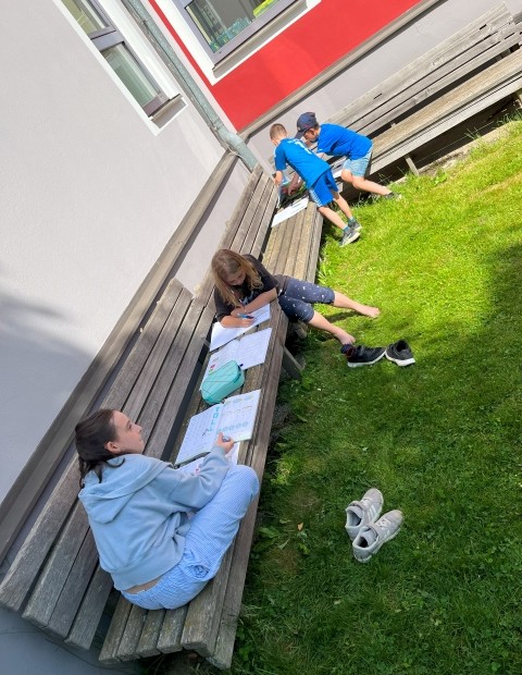 Die Schüler:innen der 3. und 4. Schulstufe nutzten das schöne sonnige Wetter und verlegten ihren Mathematikunterricht in den Garten.